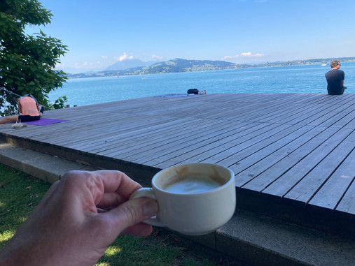 As Friday was very focused on preparing for the event, I took a rest day, but then woke up Saturday morning and walked down to the Bad Seeliken on the shores of Lake Zug. The Canton of Zug has a number of these roped off swimming areas dotted around Lake Zug. This one had lifeguards, a large wooden sun deck onshore, a cafe (see post-swim ), steps into the water, a floating dock about 10 meters offshore, a diving board and a few buoys to demarcate a swimmers-only area.